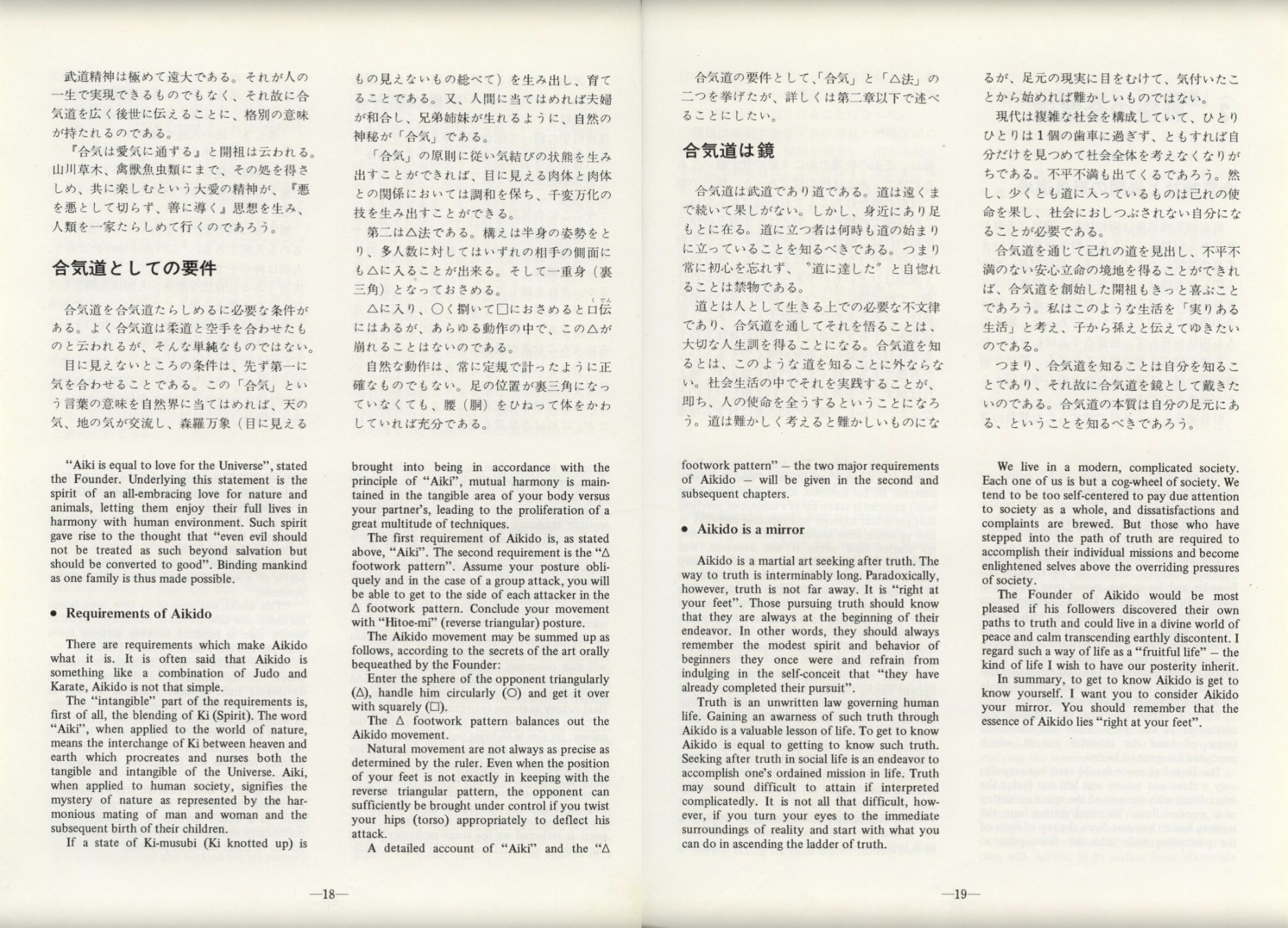 A detailed account of "Aiki" and the "△ footwork pattern" - the two major requirements of Aikido — will be given in the second and subsequent chapters.